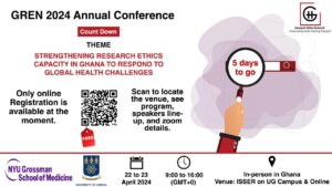 The York New University-University of Ghana Research Integrity Training Program (NYU-UG RITP) and partners are gearing up for their highly anticipated annual Ghana Research Ethics Network (GREN) conference. GREN is scheduled to take place from Monday, April 22 to Tuesday, April 23, 2024, at the Institute of Statistical, Social and Economic Research (ISSER) main auditorium, University of Ghana campus – Accra, Ghana.